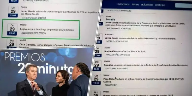 ¿Dónde estaba Feijóo? Según ha sabido El Periódico, en la agenda -ya borrada- figuraba: Feijóo asiste a la entrega de premios de 20 minutos, a las 20:00 horas. Se refiere al diario 20 minutos. Según se puede ver en la foto, Feijóo aparece junto a Isabel Díaz Ayuso en la gala realizada por el citado diario en el Teatro Real de Madrid.