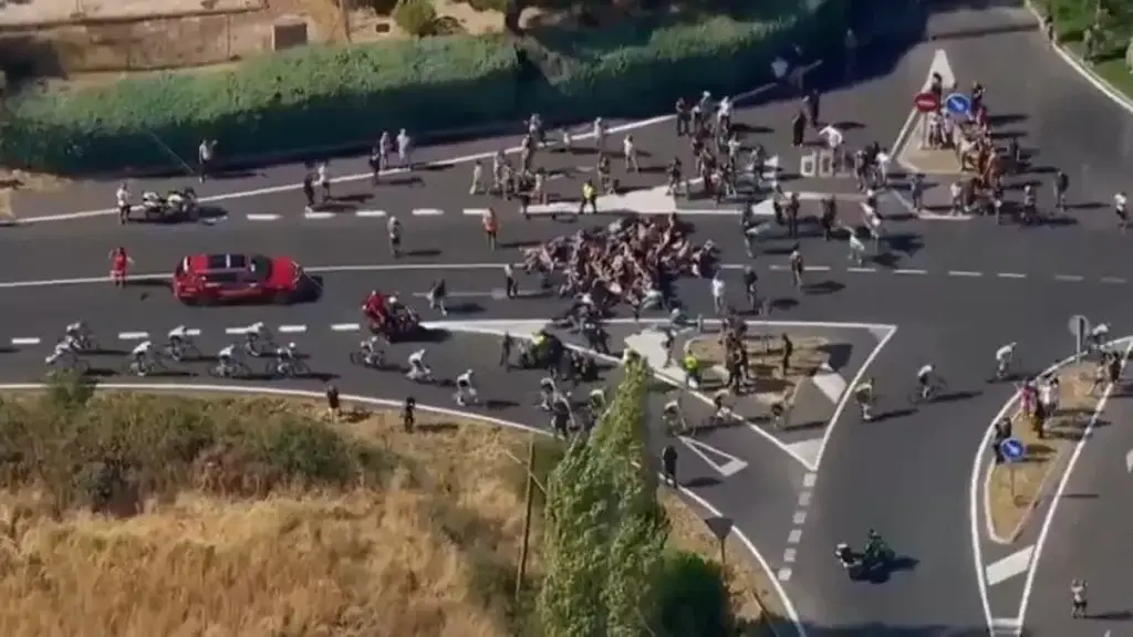 Los vehículos que acompañan a los ciclistas sí se han visto obligados a frenar durante unos minutos y el ocupante de una de las motos de seguridad ha caído al suelo al tratar de evitar a uno de los manifestantes.