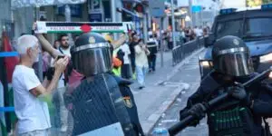 En la localidad se han concentrado centenares de personas con pancartas y banderas de Palestina y también estaban presentes cargos públicos de Podemos como su secretaria general, Ione Belarra, o la eurodiputada Irene Montero. Belarra ha hecho un llamamiento este mediodía a boicotear la etapa de este domingo de La Vuelta a su llegada a Madrid y había anunciado su presencia en las protestas.